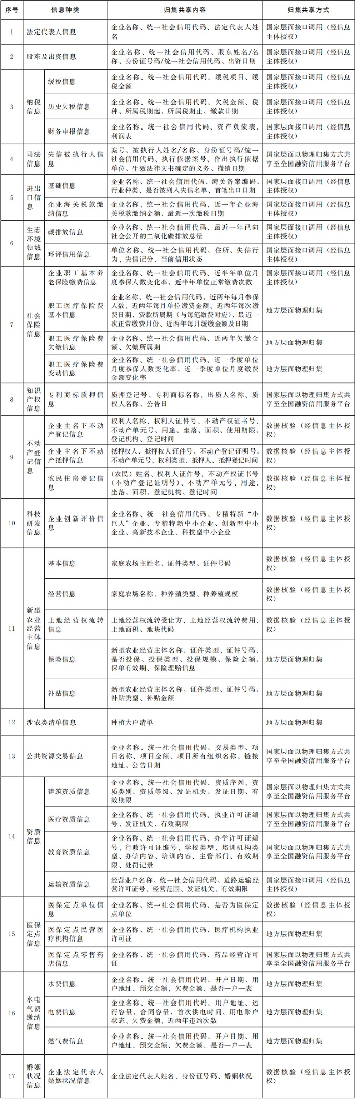 (四)明確信用信息歸集共享范圍。根據(jù)金融機(jī)構(gòu)對信用信息的實(shí)際需求,進(jìn)一步擴(kuò)大信用信息歸集共享范圍,將企業(yè)主要人員信息、各類資質(zhì)信息、進(jìn)出口信息等納入信用信息歸集共享清單(見附件),國家發(fā)展改革委牽頭適時(shí)對清單進(jìn)行更新。各地區(qū)要充分發(fā)揮地方融資信用服務(wù)平臺作用,進(jìn)一步破除數(shù)據(jù)壁壘,依法依規(guī)加大清單外信用信息歸集共享力度,結(jié)合本地區(qū)實(shí)際編制省級信用信息歸集共享清單,有效拓展數(shù)據(jù)歸集共享的廣度與深度。